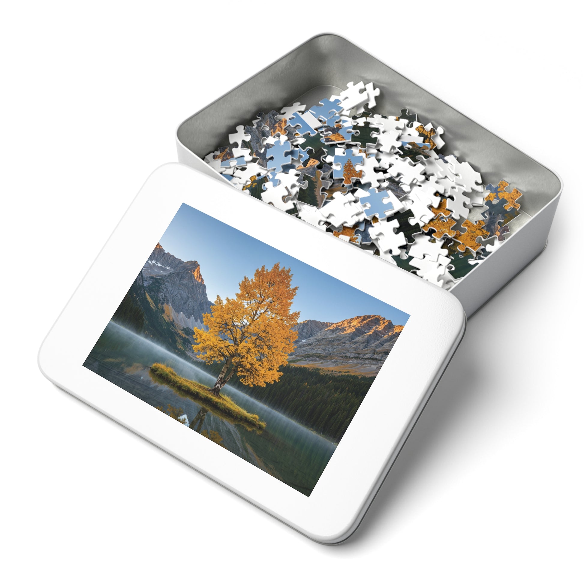 110, 252, 500, 1000, 2000 Autumn Landscape Jigsaw Puzzle with Tin, Golden Autumn Tree Lake Puzzle, Autumn Tree & Calm Waters, Misty Lake and Rocky Peaks Jigsaw