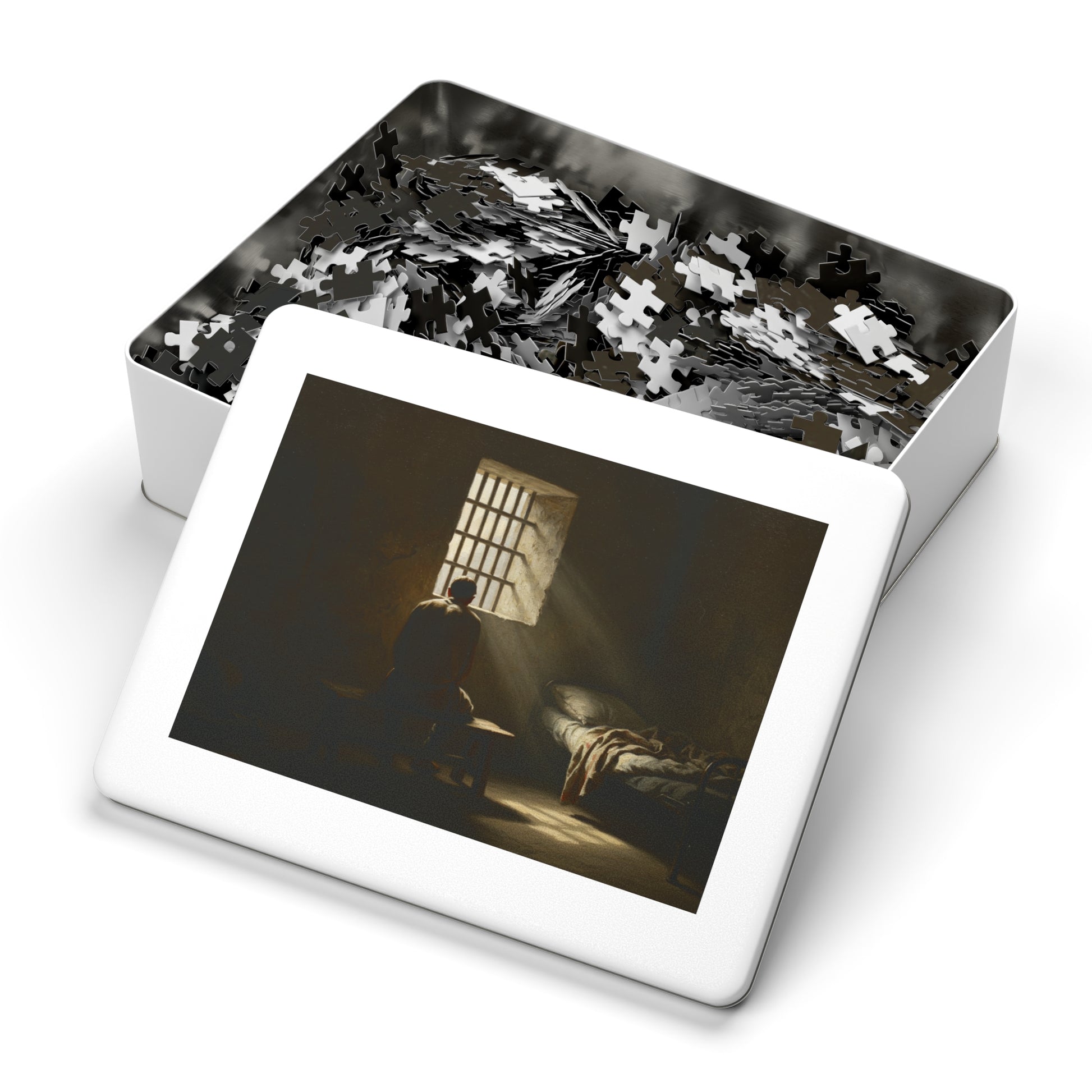🌑 Step into a powerful moment of solitude with this thought-provoking jigsaw puzzle. The artwork captures a lone figure sitting in a dim prison cell, illuminated by a beam of light streaming through barred windows. The interplay of shadow and light evokes themes of hope, reflection, and resilience.