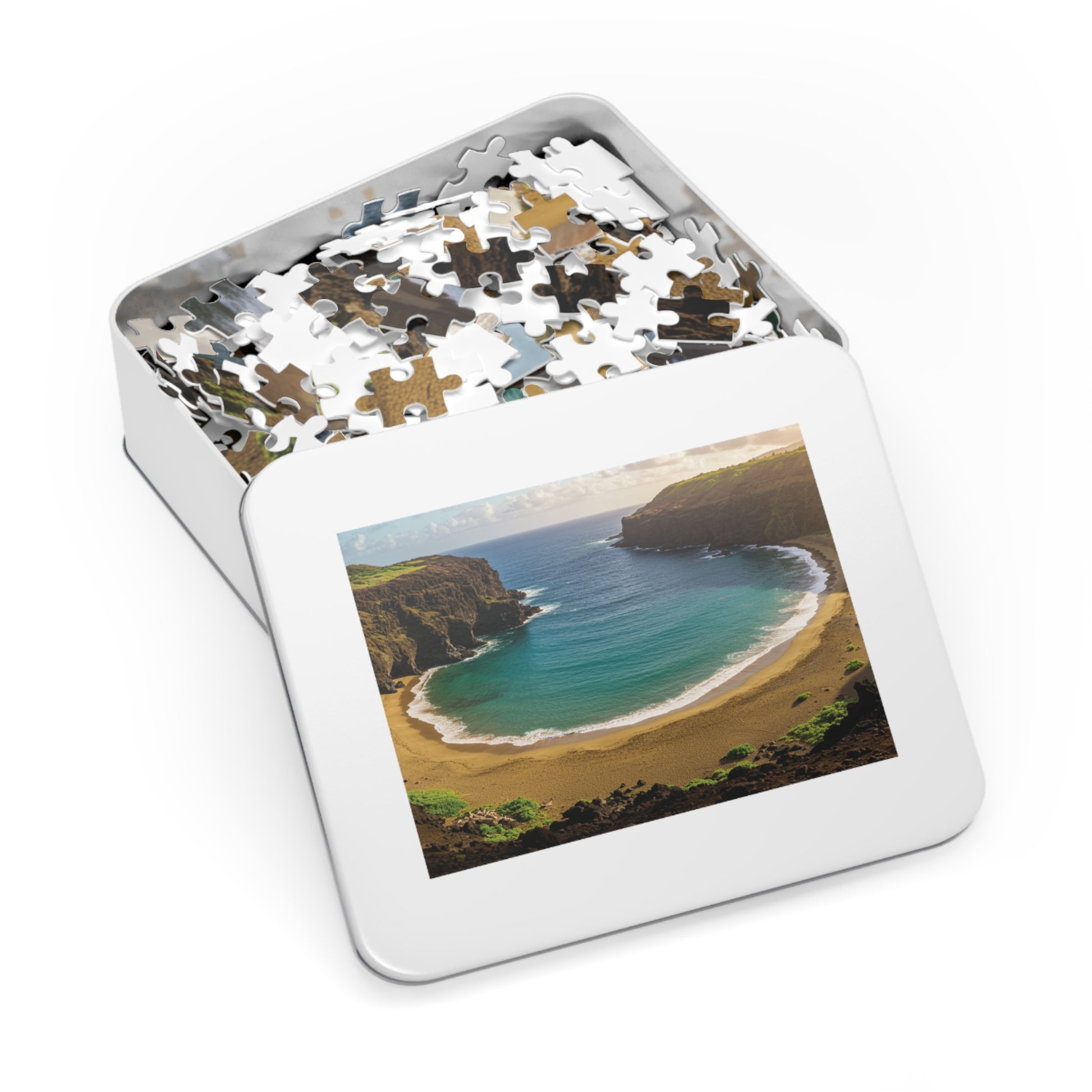 🖼️ Puzzle Theme: A tranquil hidden cove with sunlit waves, lush greenery, and dramatic coastal cliffs