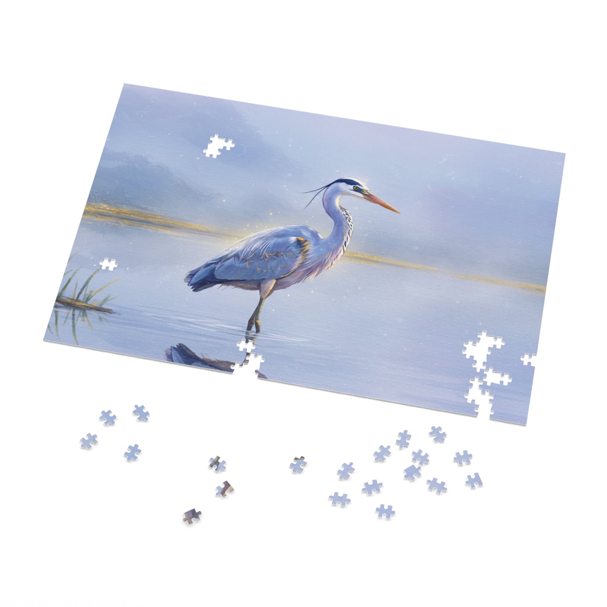 🦢 Embrace the serenity of nature with this beautifully illustrated jigsaw puzzle featuring a majestic heron standing gracefully in calm waters. Surrounded by misty hues and a soft golden glow on the horizon, this artwork evokes peace and stillness.