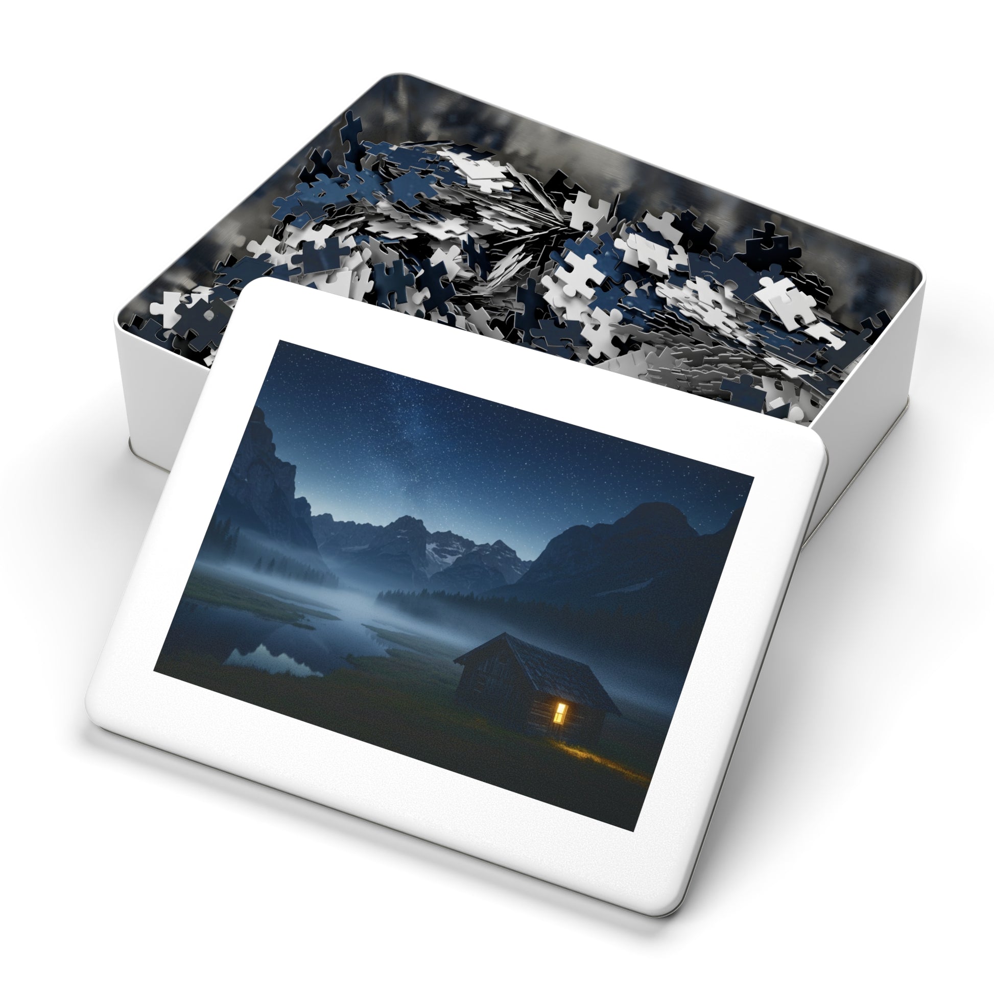 110, 252, 500, 1000, 2000 Starry Night Cabin Puzzle, Tranquil Nightscape Puzzle, Nighttime Cabin Under Stars, Twilight Mountains and Lit Cabin, Foggy Valley and Star-Filled Sky, Wilderness Cabin Puzzle
