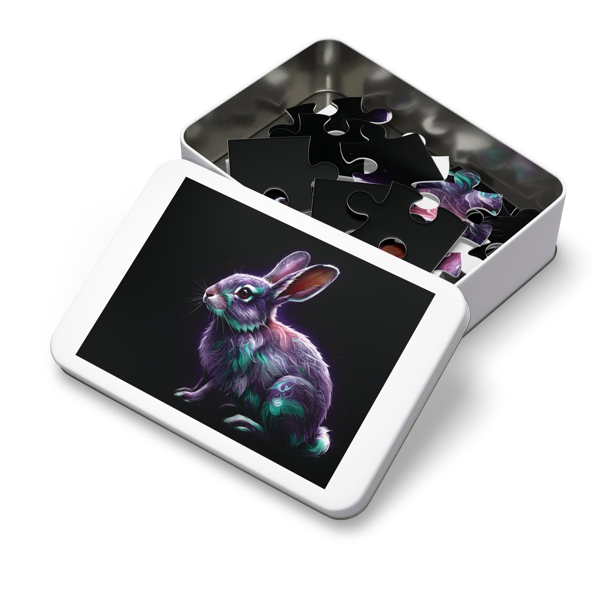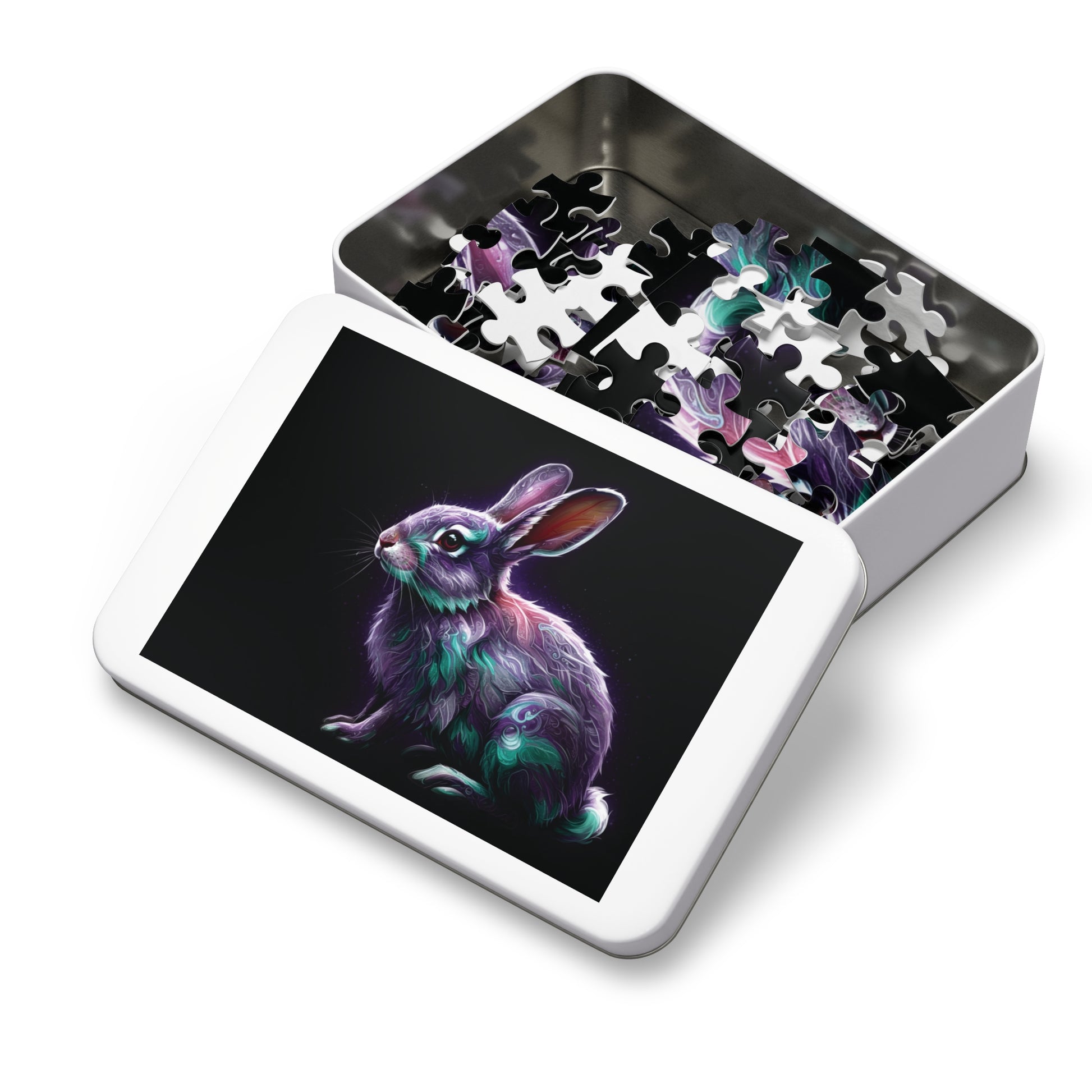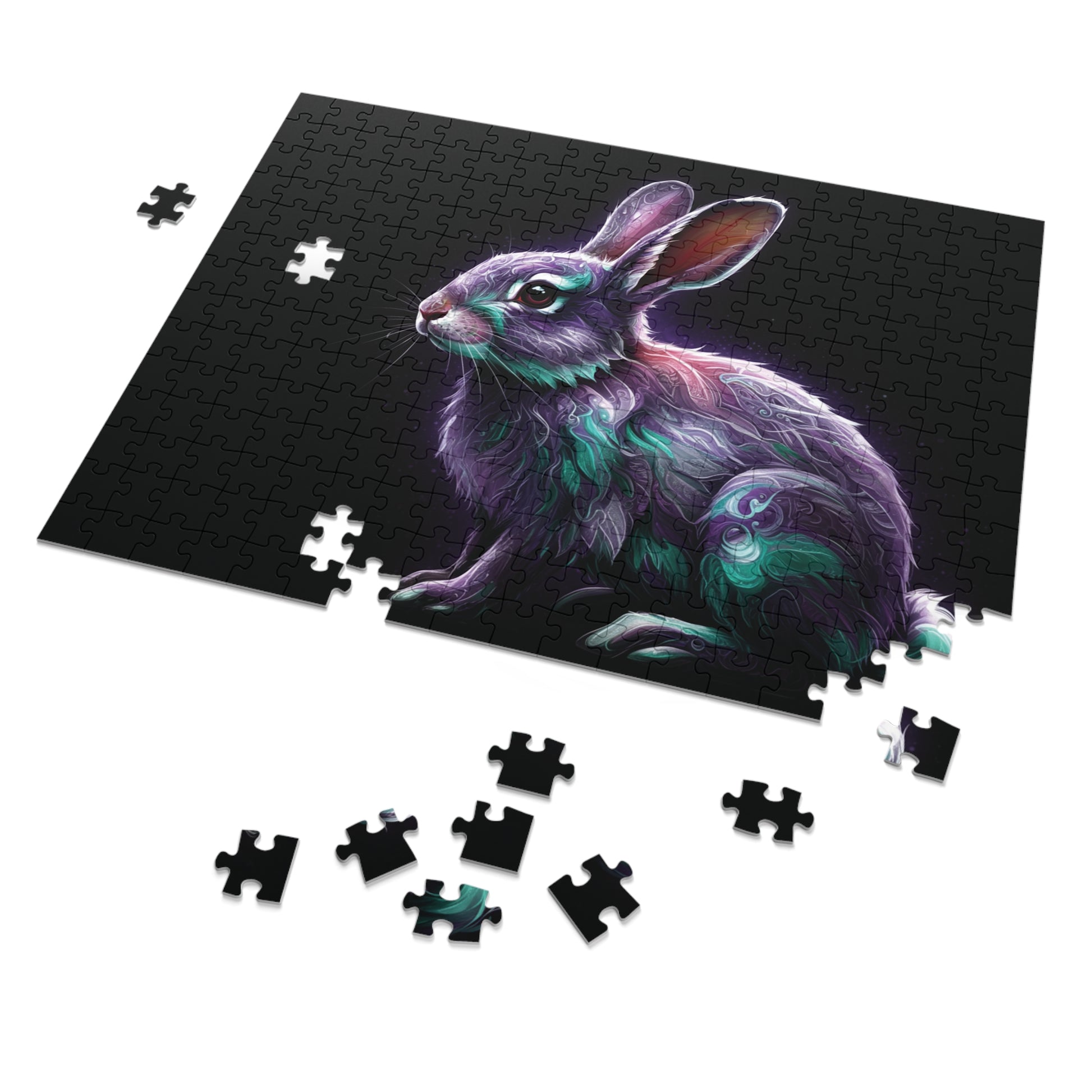 🌟 Step into a world of vibrant fantasy with this stunning jigsaw puzzle featuring a glowing, neon-inspired rabbit adorned with intricate patterns. The luminous purples, greens, and blues against a dark background create a mesmerizing contrast that brings this mystical creature to life.