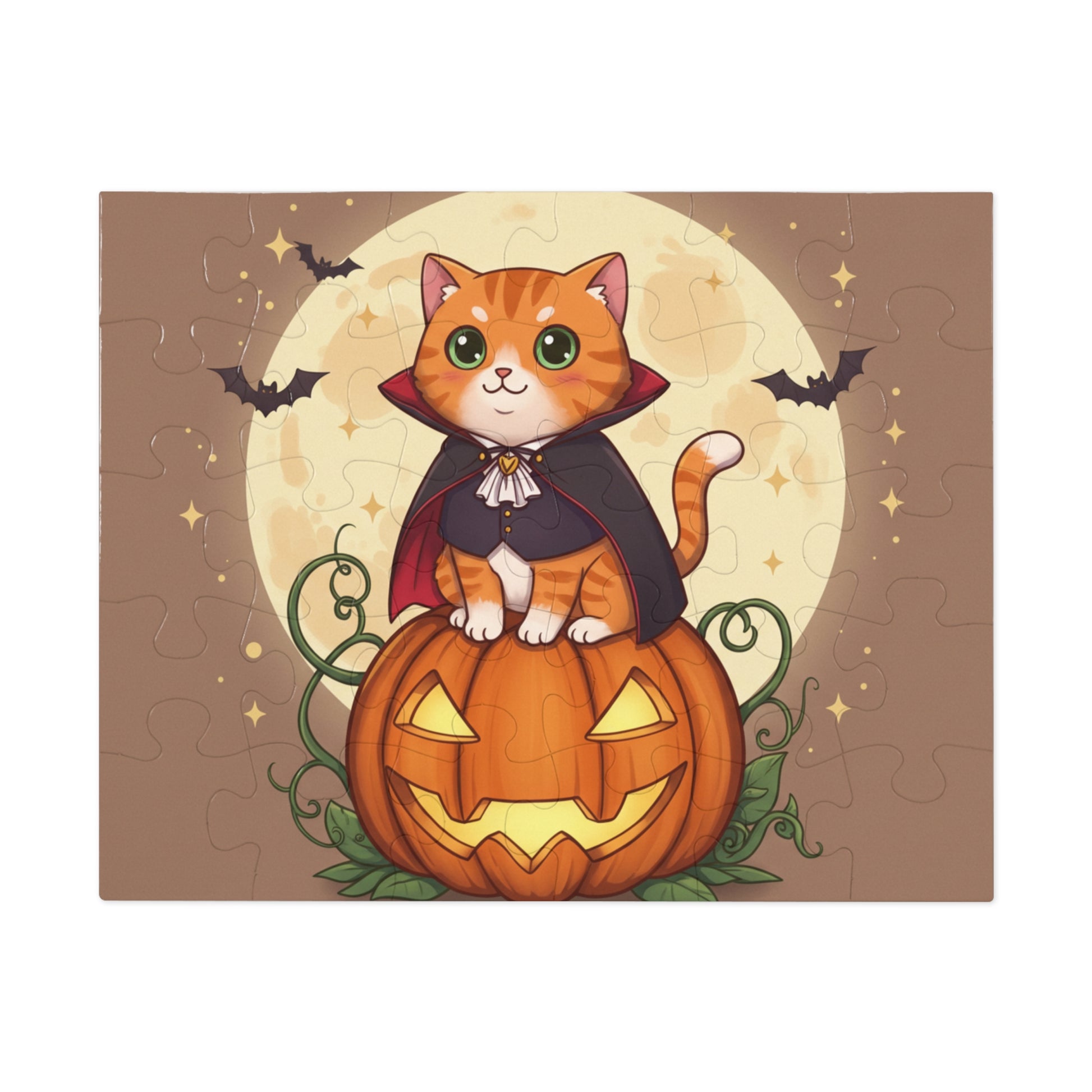 🎃 Celebrate the spooky season with this charming jigsaw puzzle featuring an adorable orange kitten dressed as a vampire. Sitting proudly on a glowing jack-o’-lantern, the kitty is framed by a full moon, twinkling stars, and flying bats for the perfect Halloween vibe.