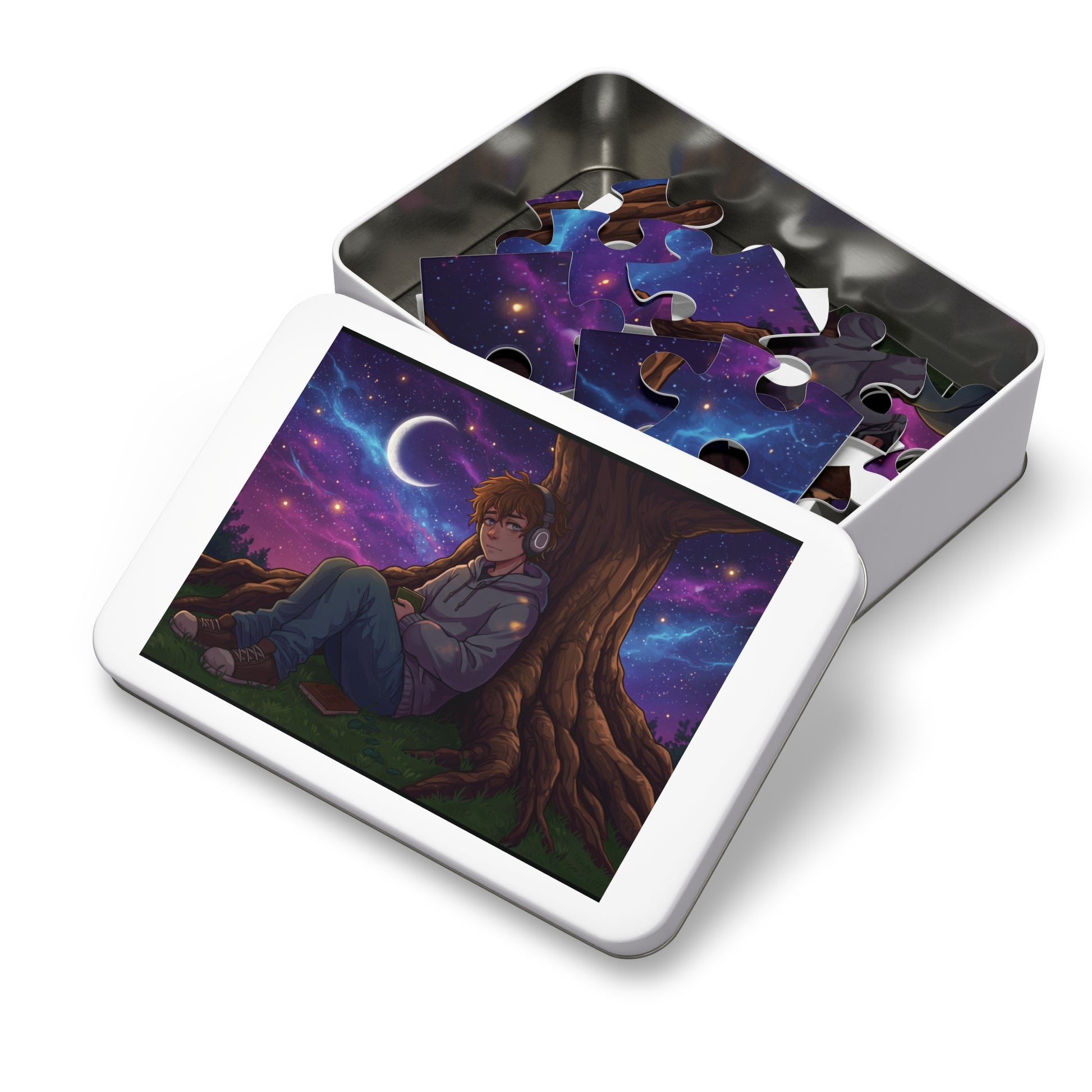 30, 110 pics Anime Night Sky Jigsaw Puzzle – Cozy Hoodie Character Under Crescent Moon with Galaxy Background