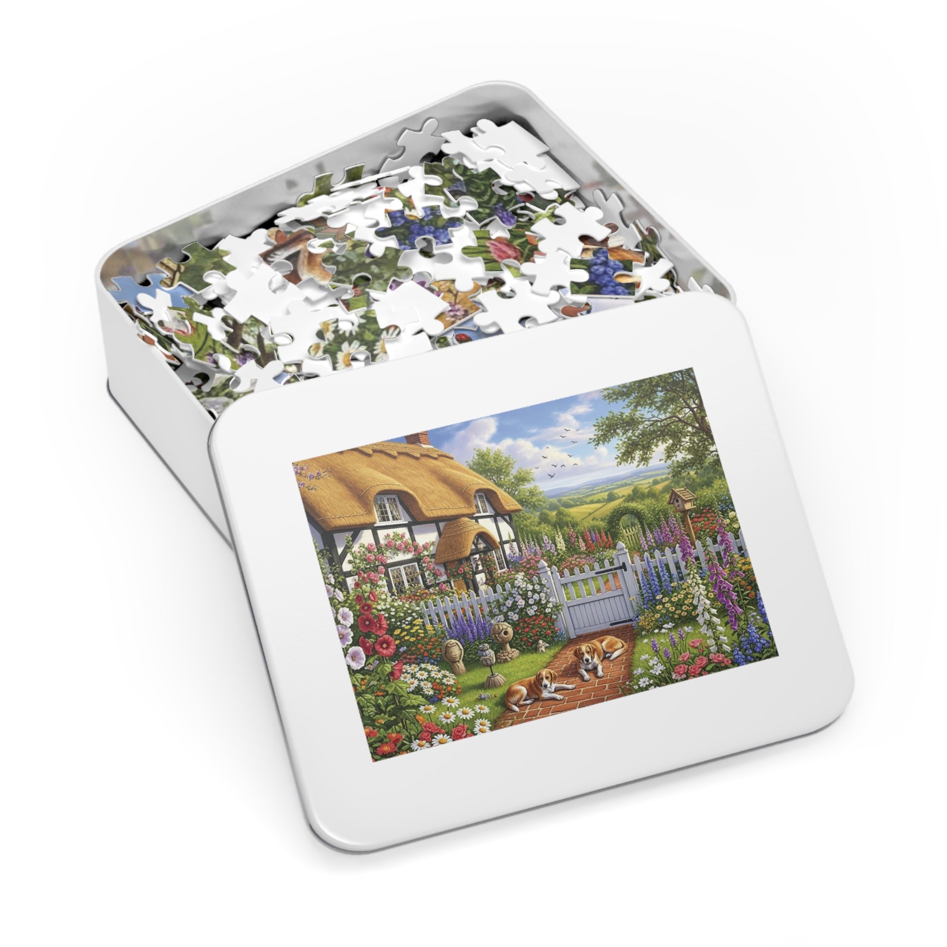 This beautifully illustrated jigsaw puzzle captures the timeless charm of a traditional thatched cottage surrounded by blooming flowers, lush greenery, and a welcoming garden path. A white picket fence frames the scene, with climbing roses, hollyhocks, and cottage blooms spilling over into the lawn. Two loyal dogs rest along the brick walkway, adding warmth and life to this serene countryside moment.