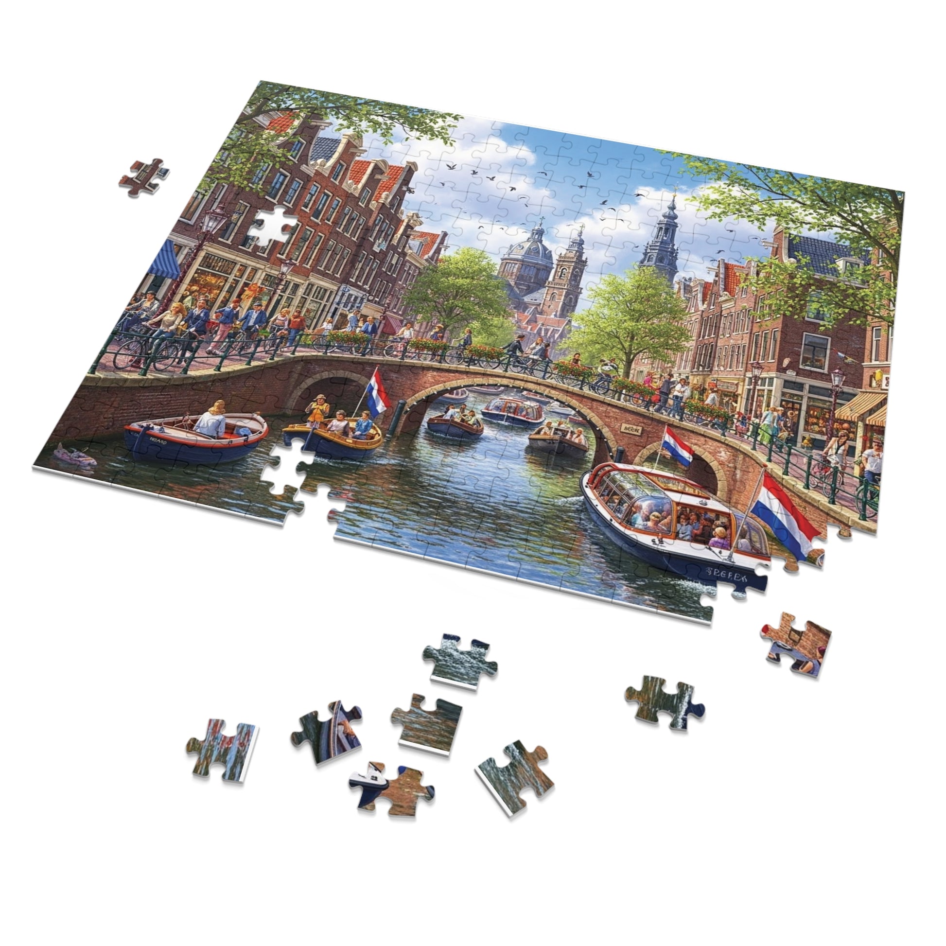 This beautifully illustrated jigsaw puzzle captures a vibrant day along a classic Amsterdam style canal. Elegant brick buildings line the water, cyclists and pedestrians cross a flower-filled bridge, and boats glide gently beneath. Dutch flags flutter in the breeze as historic church towers rise above the rooftops, creating a scene full of movement, culture, and charm.