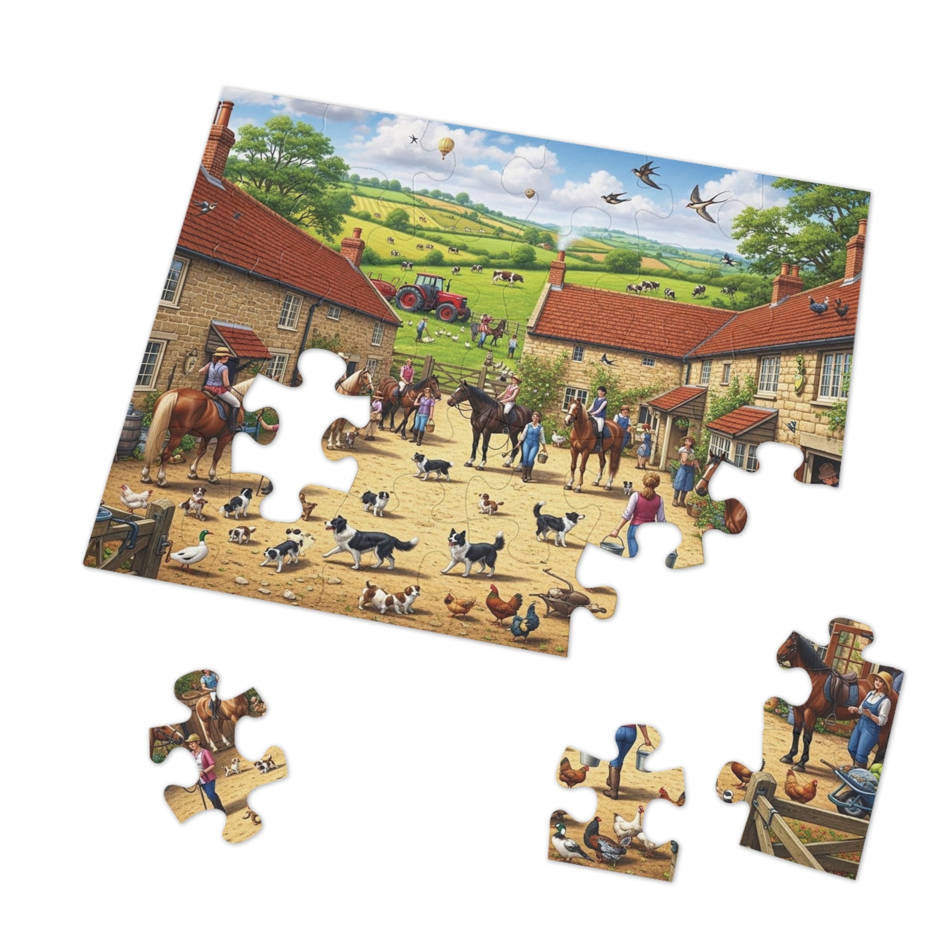This beautifully illustrated jigsaw puzzle captures a lively farmyard courtyard filled with warmth, movement, and countryside character. Surrounded by stone cottages with red tiled roofs, the scene features horses being groomed and ridden, playful farm dogs, chickens and ducks wandering the yard, and farmers going about their daily routines. Rolling green hills, grazing cows, a red tractor at work, birds in flight, and hot air balloons drifting overhead complete this rich rural story.