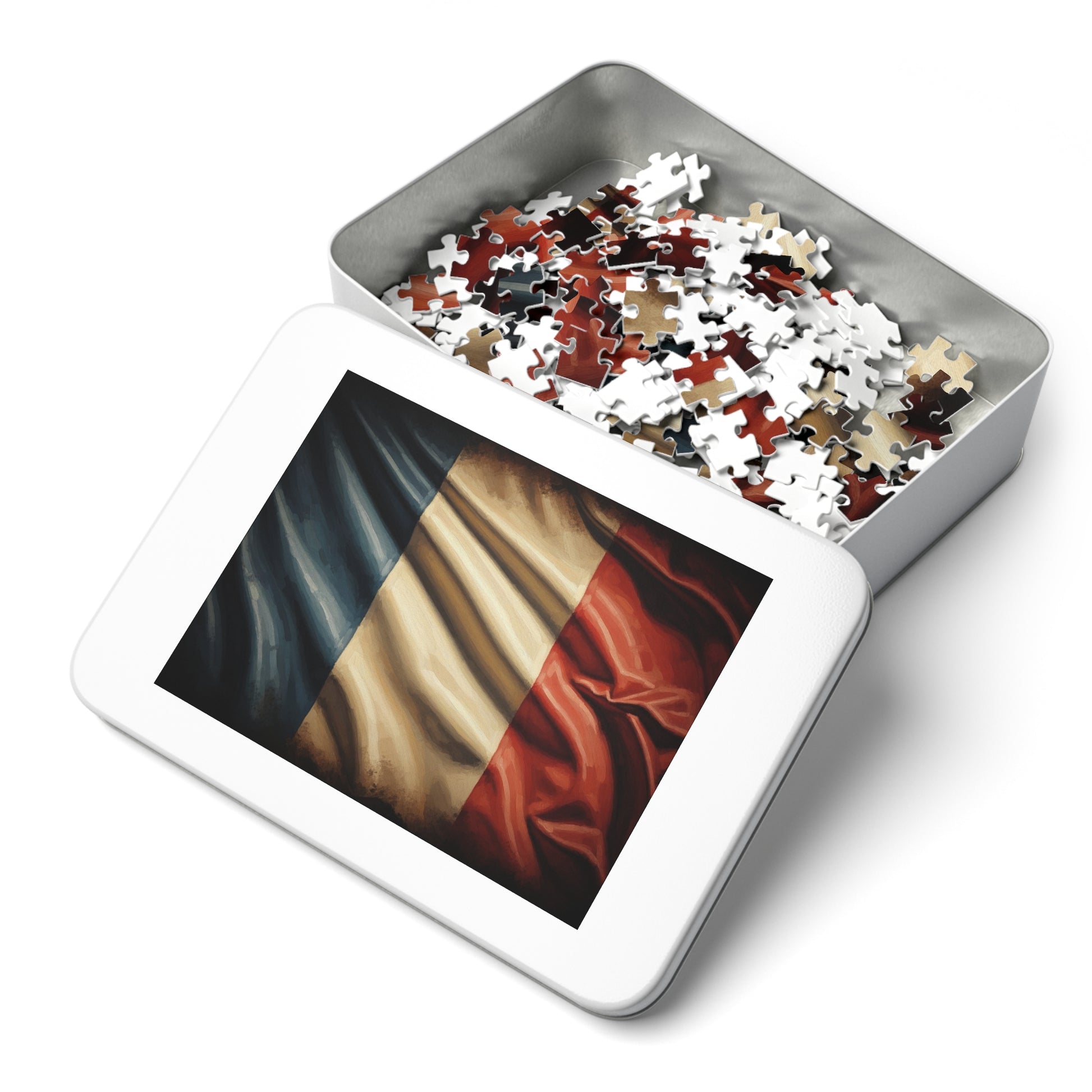 🇫🇷 Celebrate French heritage with this elegant vintage-style French tricolor puzzle. Featuring the iconic blue, white, and red vertical bands with a textured, fabric-inspired finish, this artwork reflects history, culture, and national pride. Subtle lighting and rich tones give the flag a timeless, painterly character, making it perfect for display, gifting, or quiet reflection.