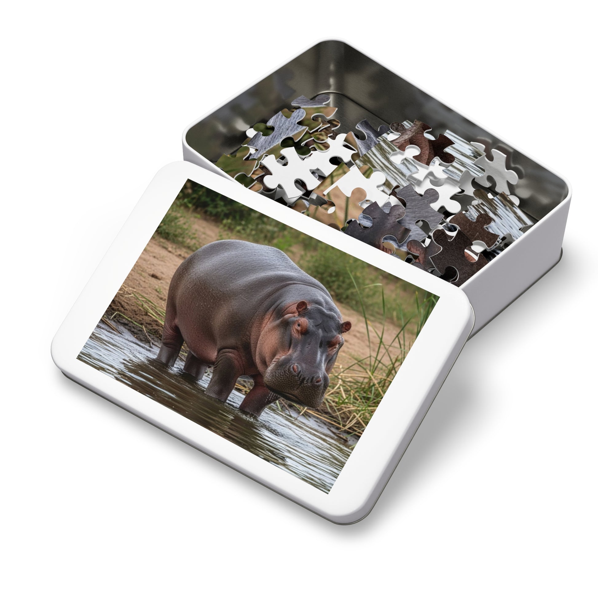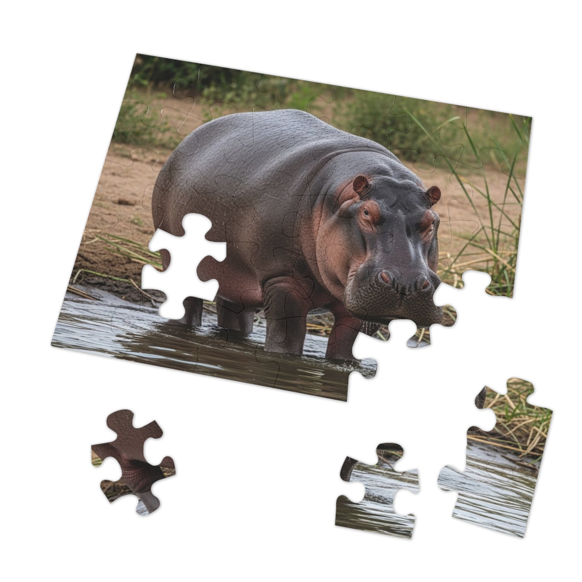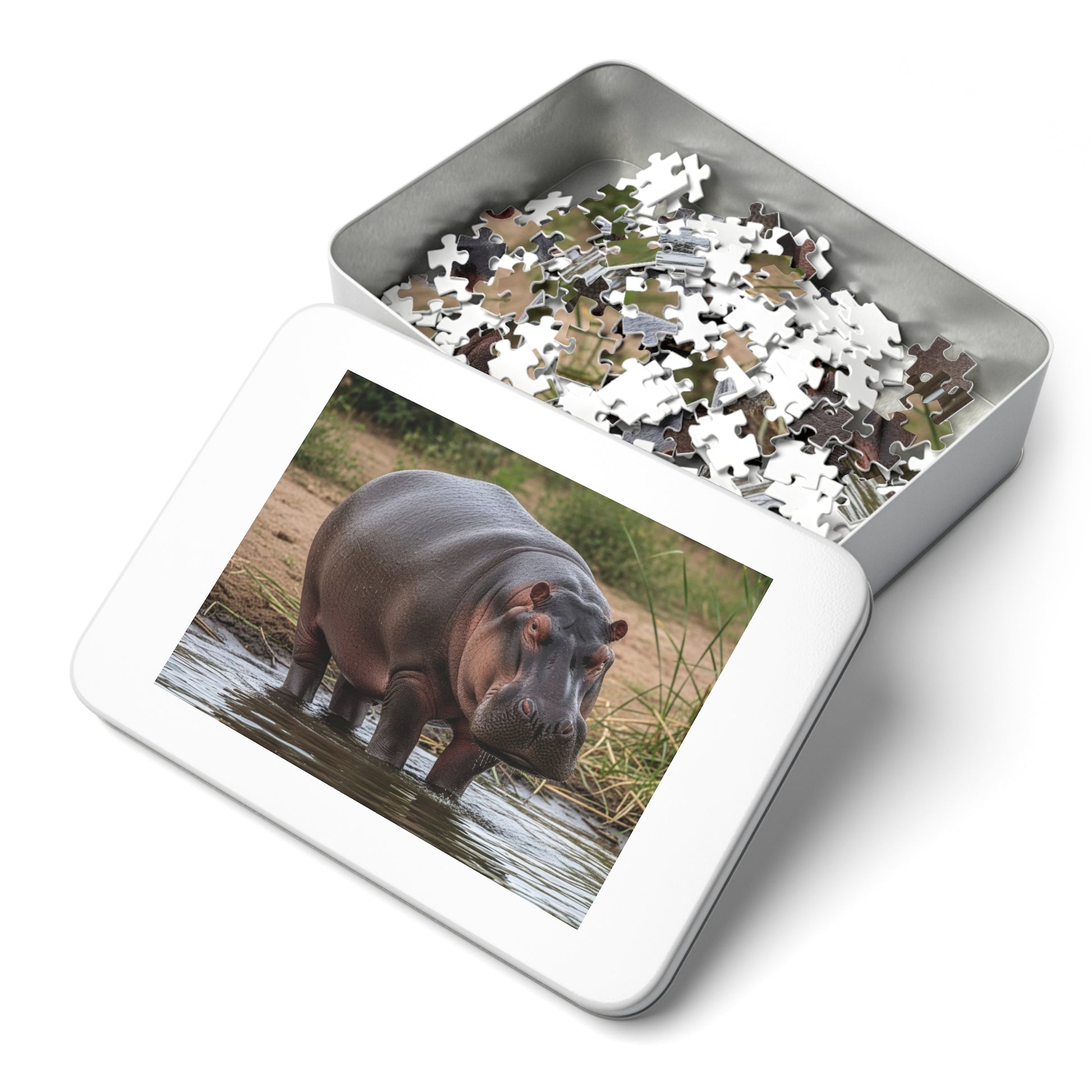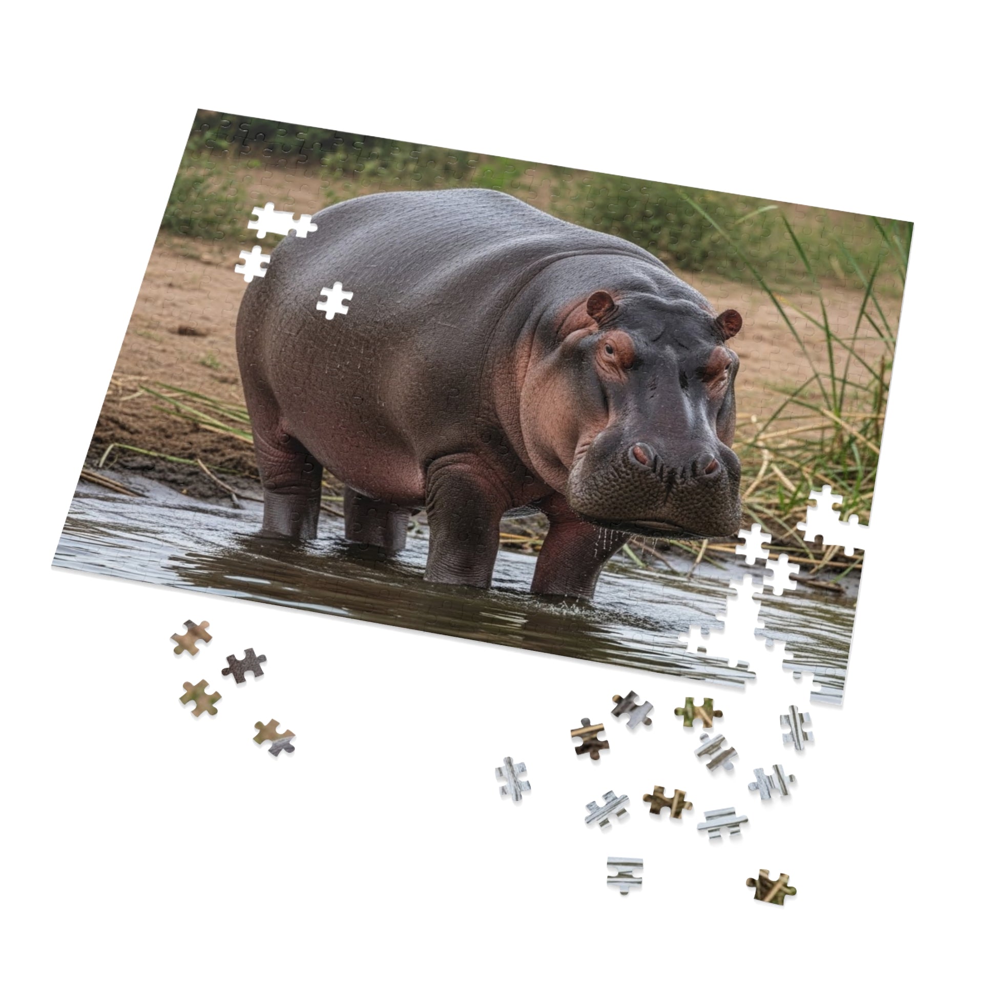 This striking jigsaw puzzle features a majestic hippopotamus standing peacefully in shallow river water, surrounded by reeds and earthy riverbanks. The hippo’s powerful build, textured skin, and steady gaze create a scene that balances strength with stillness. Soft water reflections and natural tones invite focus, patience, and mindful relaxation, making this puzzle both grounding and visually captivating.
