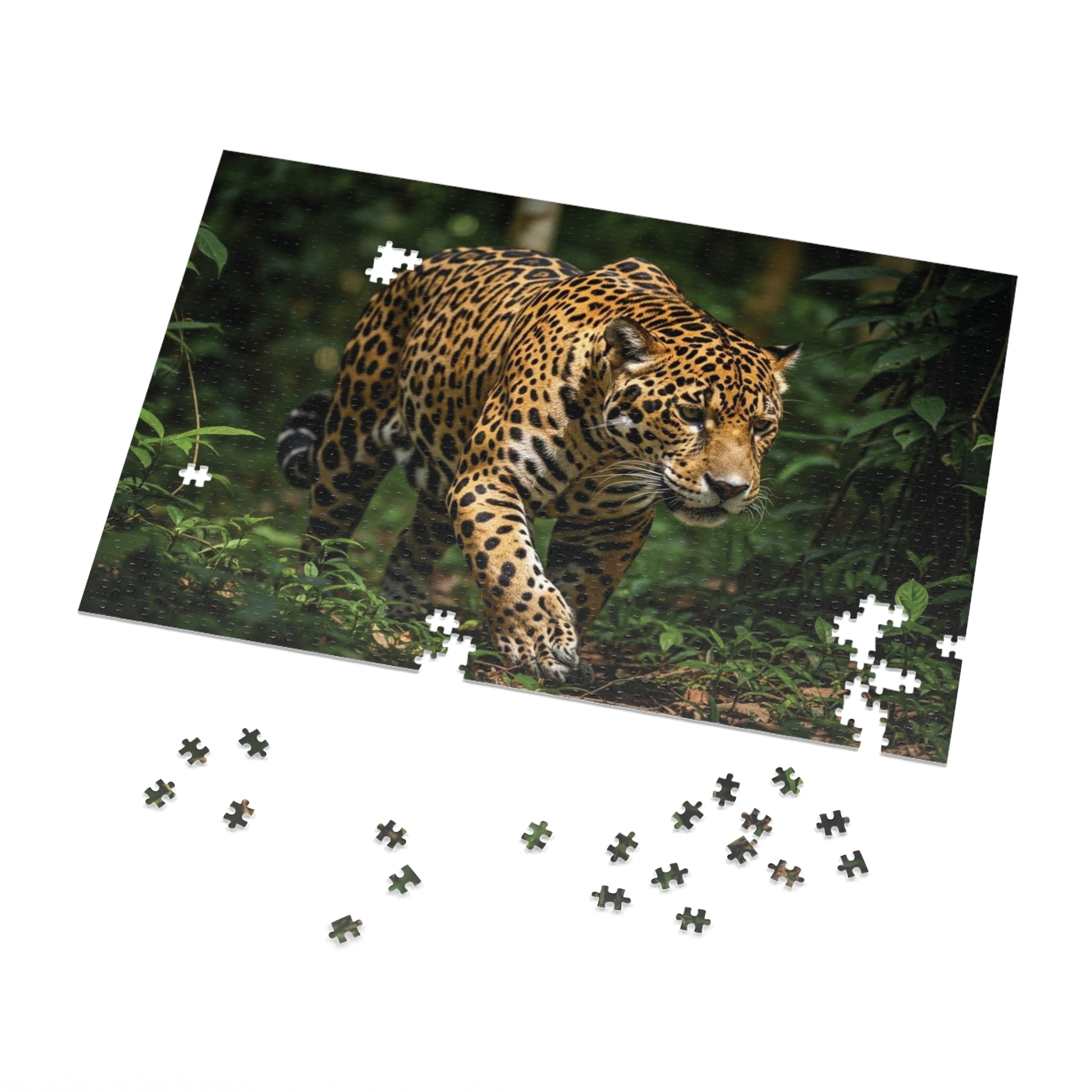 This striking jigsaw puzzle captures a powerful jaguar moving silently through dense rainforest foliage. Its golden coat, dramatic rosette markings, and focused gaze reflect strength, confidence, and balance in the wild. The deep green surroundings and rich natural textures create an immersive scene that feels intense yet grounding, perfect for mindful focus and rewarding puzzle sessions.