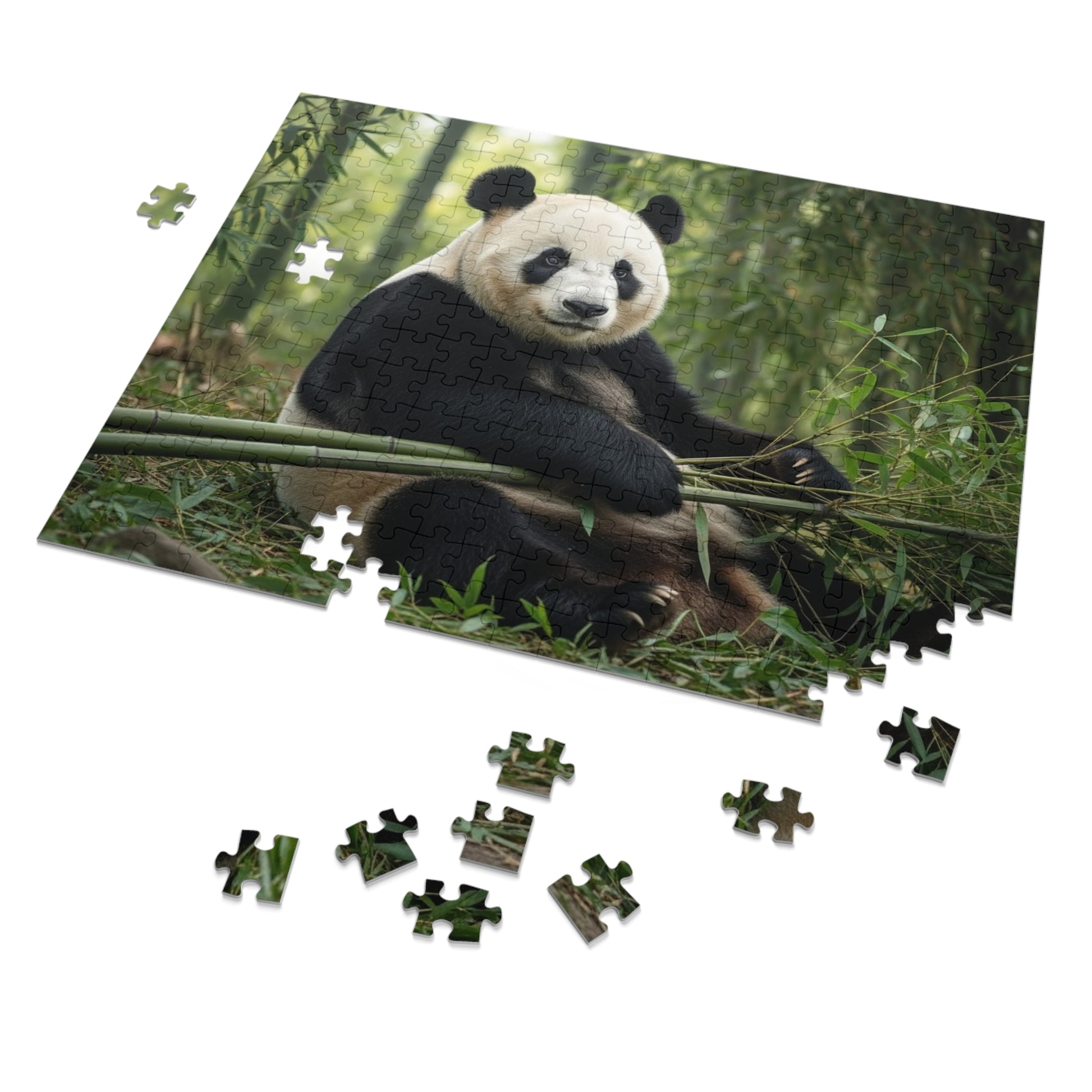 This beautifully balanced jigsaw puzzle features a giant panda resting peacefully while holding fresh bamboo, surrounded by soft green foliage and filtered forest light. The panda’s relaxed posture, expressive eyes, and contrasting black and white fur create a scene that feels nurturing, grounding, and quietly joyful. It is an image that invites patience, focus, and slow appreciation of nature’s softer rhythms.