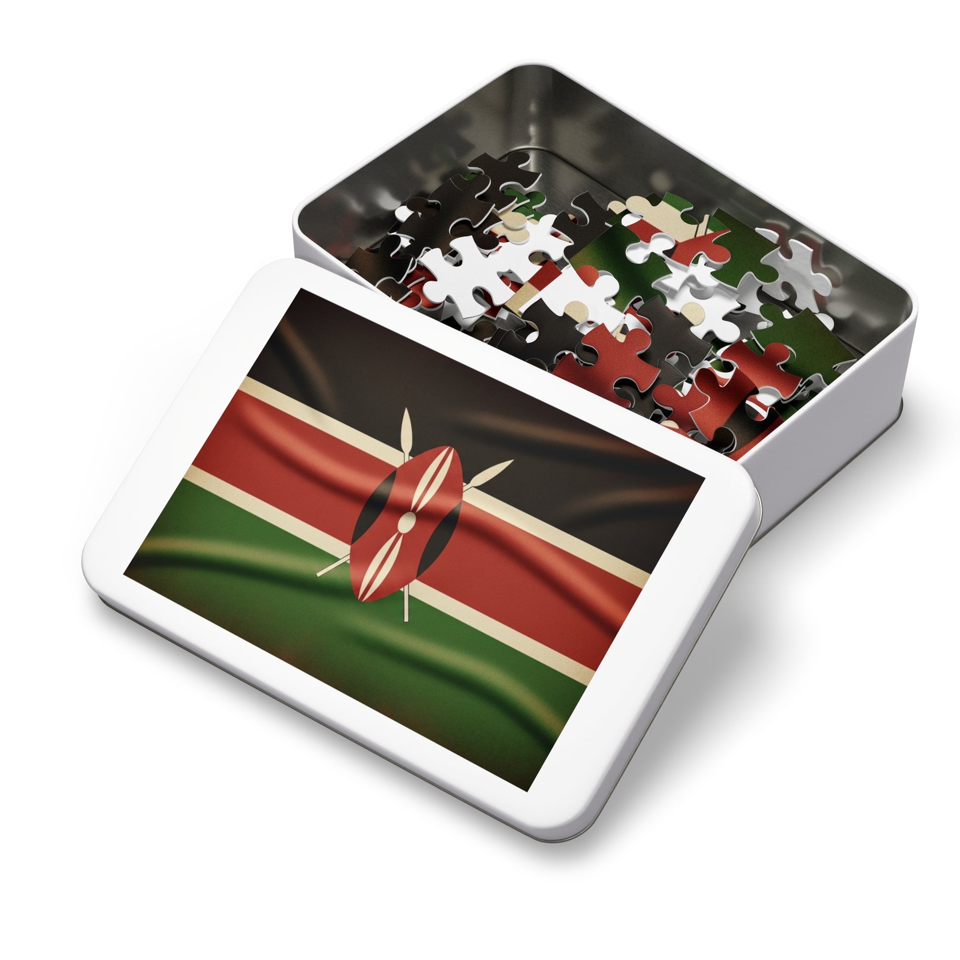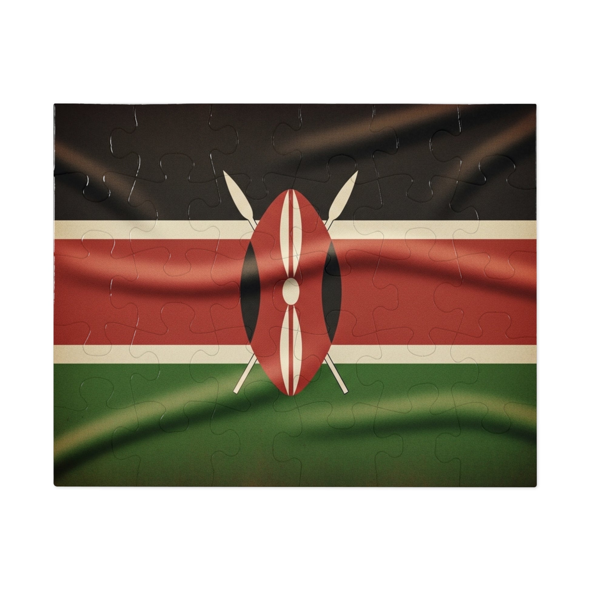 Celebrate Kenya’s rich heritage with this powerful jigsaw puzzle featuring the iconic black, red, and green stripes centered by the traditional Maasai shield and crossed spears. Enhanced with realistic fabric texture and natural folds, the design brings depth, motion, and symbolism to life.