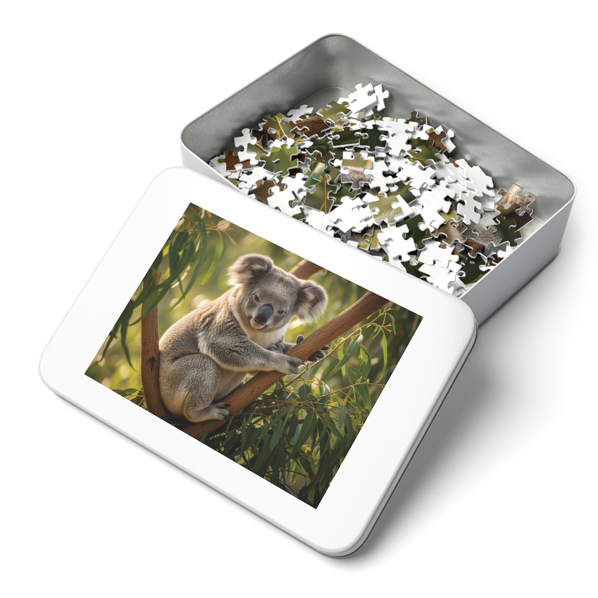 This soothing jigsaw puzzle features a gentle koala resting comfortably on a eucalyptus tree, surrounded by soft green foliage and warm natural light. The koala’s calm expression and plush grey fur capture a moment of quiet connection with nature, evoking feelings of comfort, patience, and mindfulness. The scene feels slow, nurturing, and grounding, making it perfect for relaxed puzzle sessions and mindful breaks.