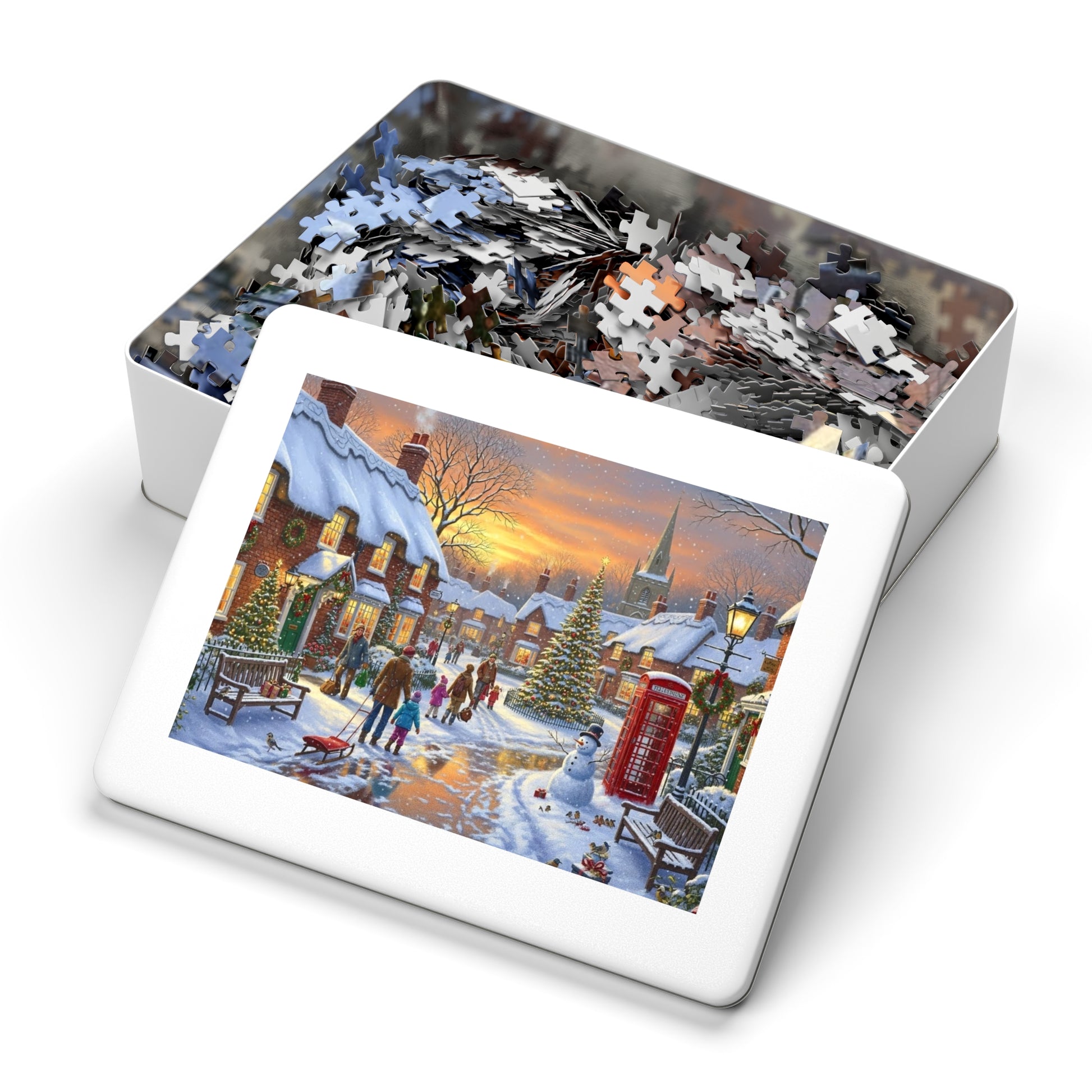 This beautifully illustrated jigsaw puzzle captures a heartwarming winter evening in a traditional Christmas village. Snow blankets charming brick cottages as warm golden light glows from the windows. A decorated Christmas tree stands proudly in the village square, children play in the snow, families stroll along icy paths, and birds gather near benches. In the distance, a church spire rises against a glowing winter sunset sky, completing this magical holiday scene.
