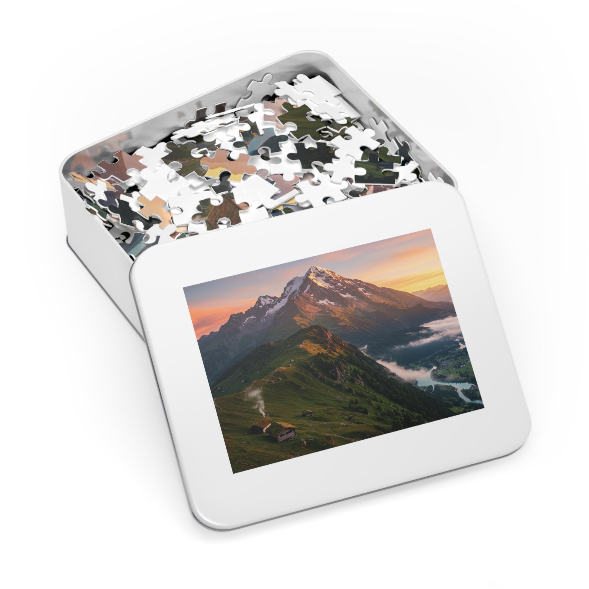 Sunrise Over Forested Hills Jigsaw Puzzle (252, 500, 1000, 2000 pcs) – Cabins, Snowy Ridge & Glowing Sky
