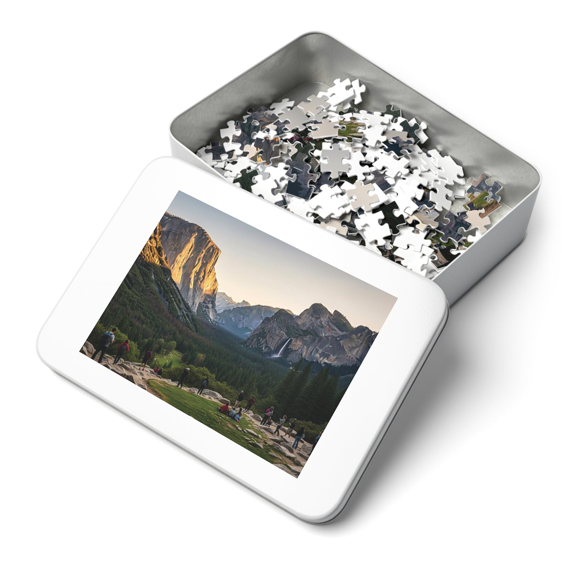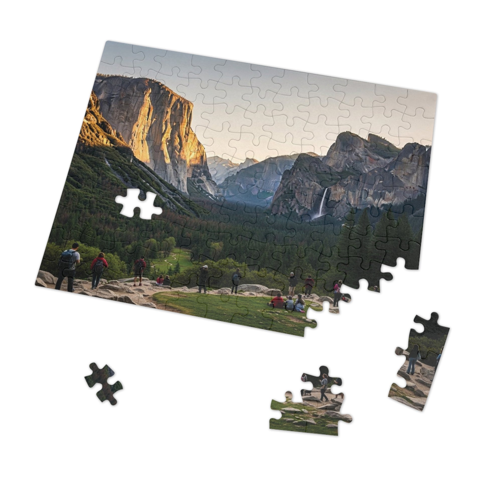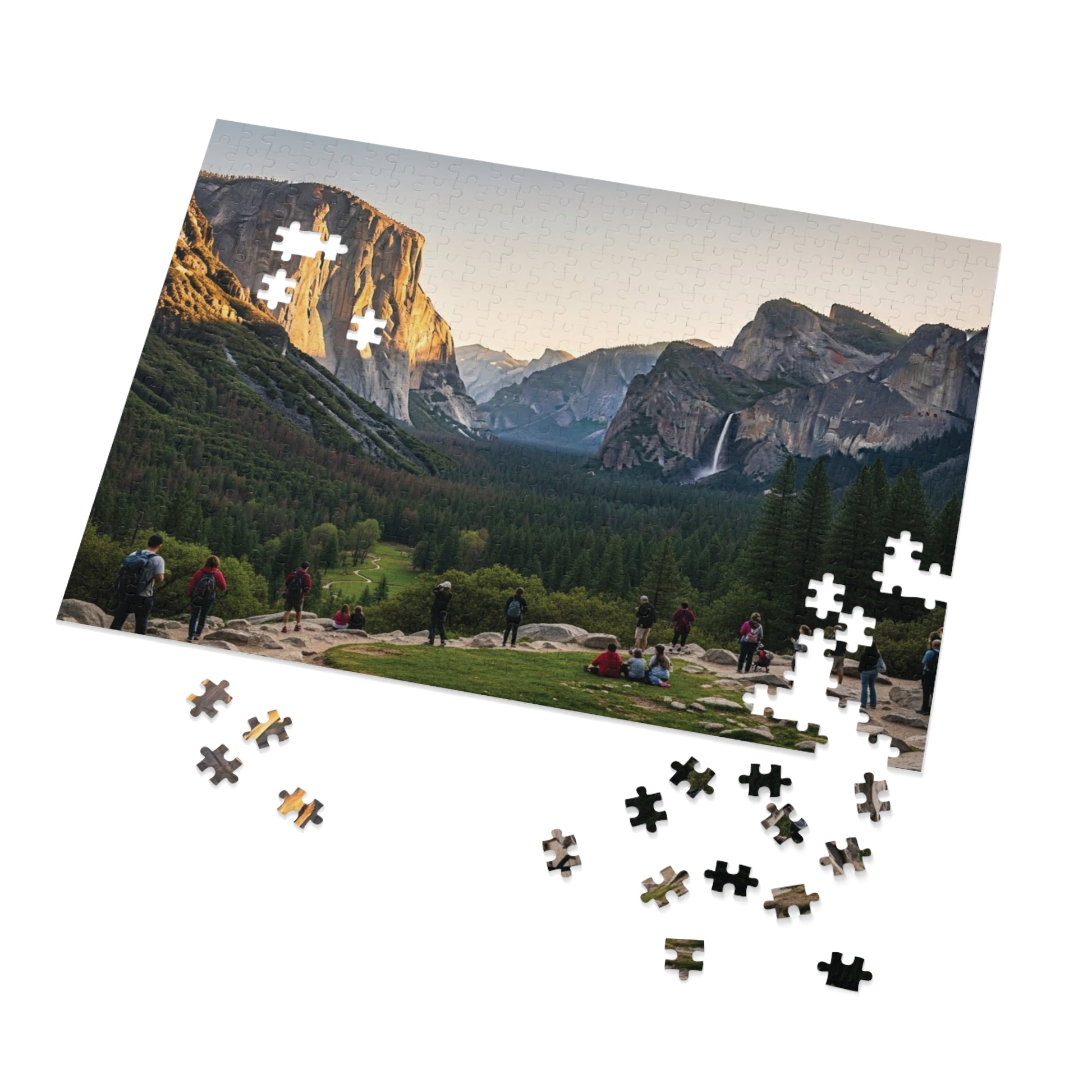 Captured at golden hour ☀️, towering granite cliffs glow with warm light while cascading waterfalls, vast pine forests 🌲, and open meadows create a scene of pure awe and scale. Visitors gathered at the valley overlook add life and perspective, making this puzzle feel immersive, inspiring, and deeply grounding.