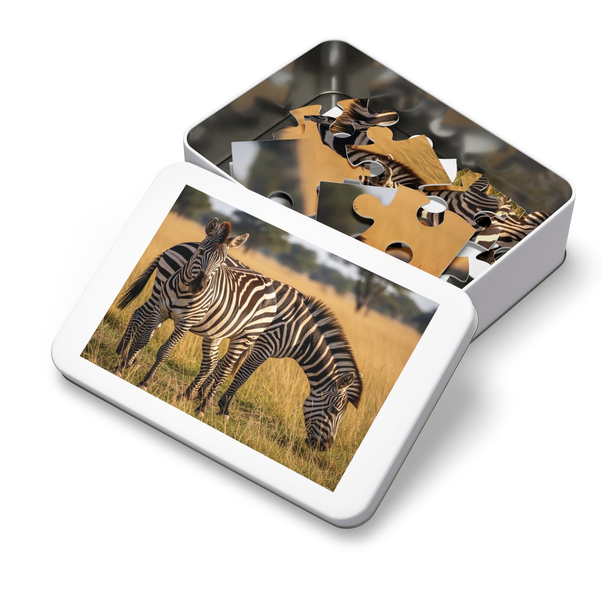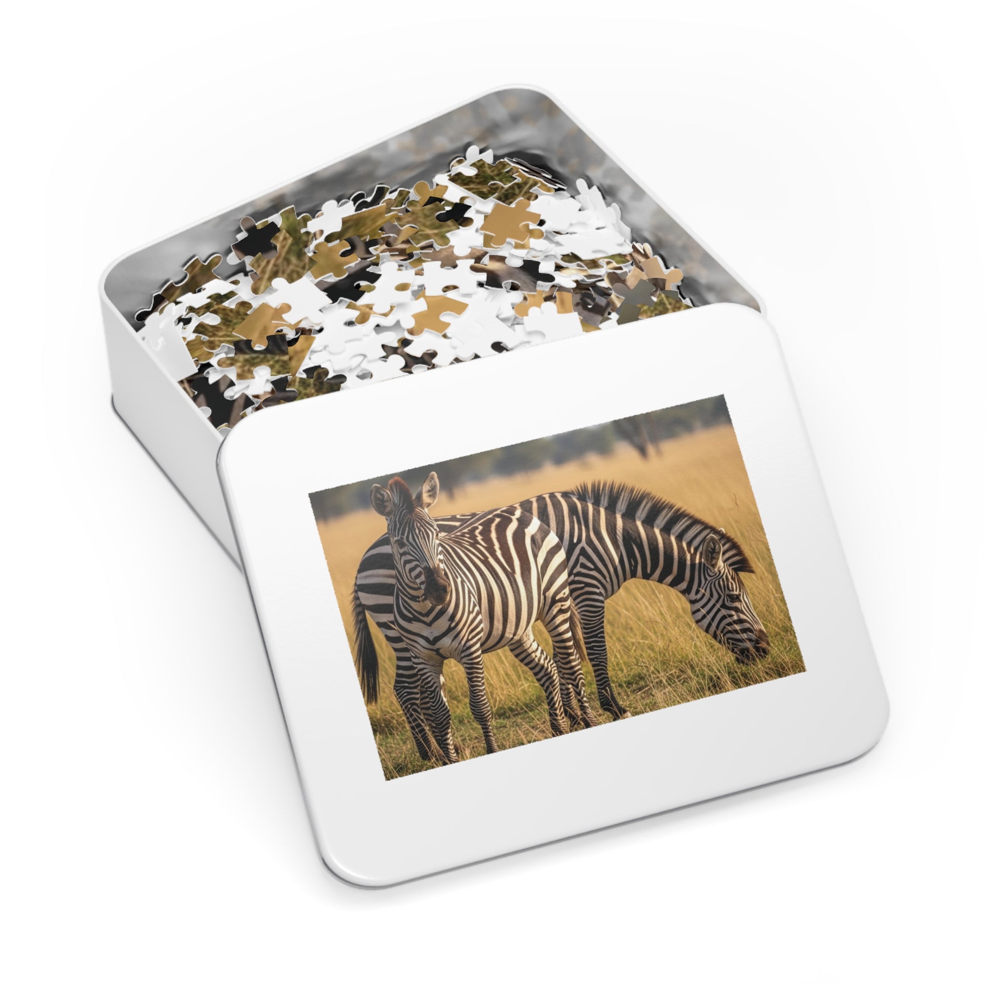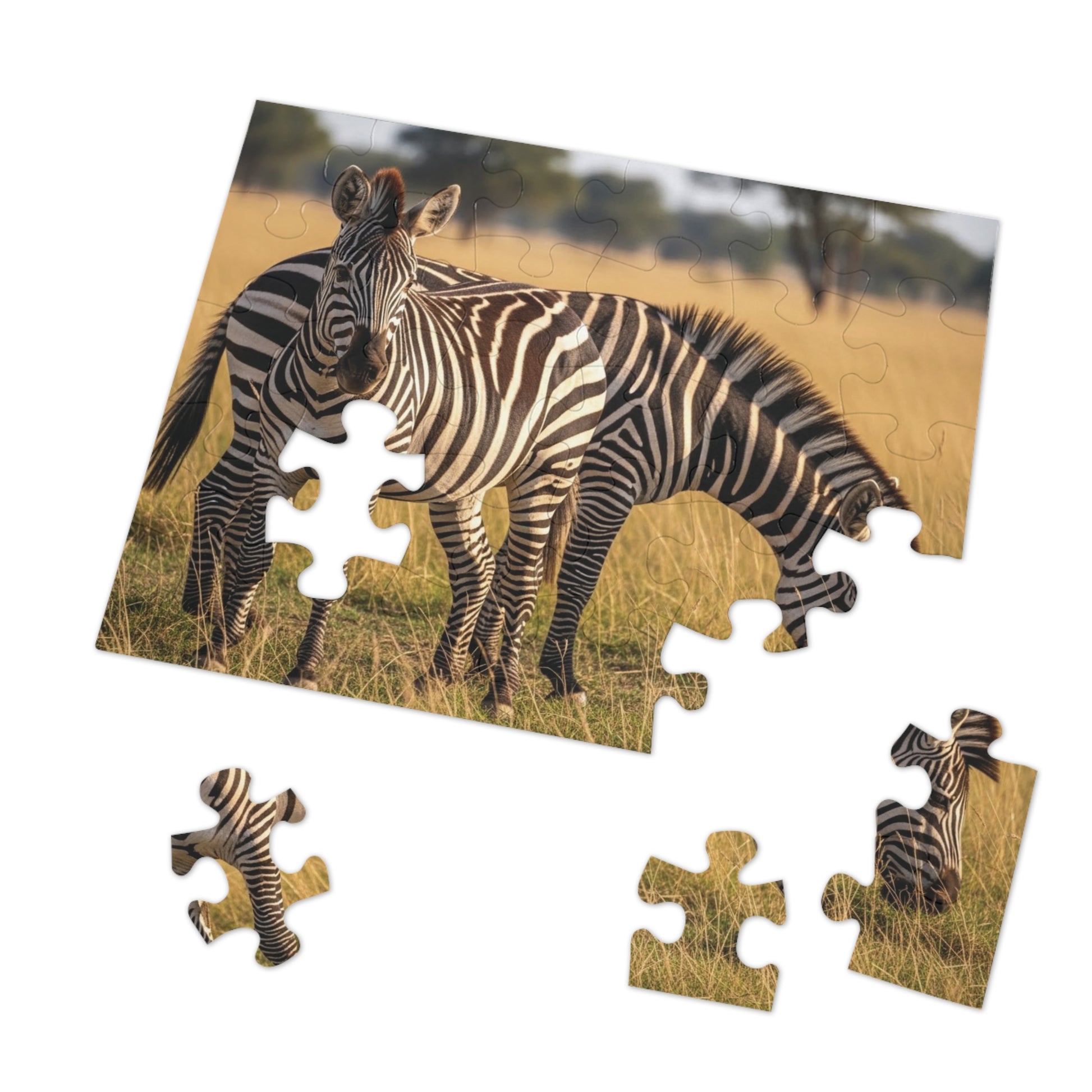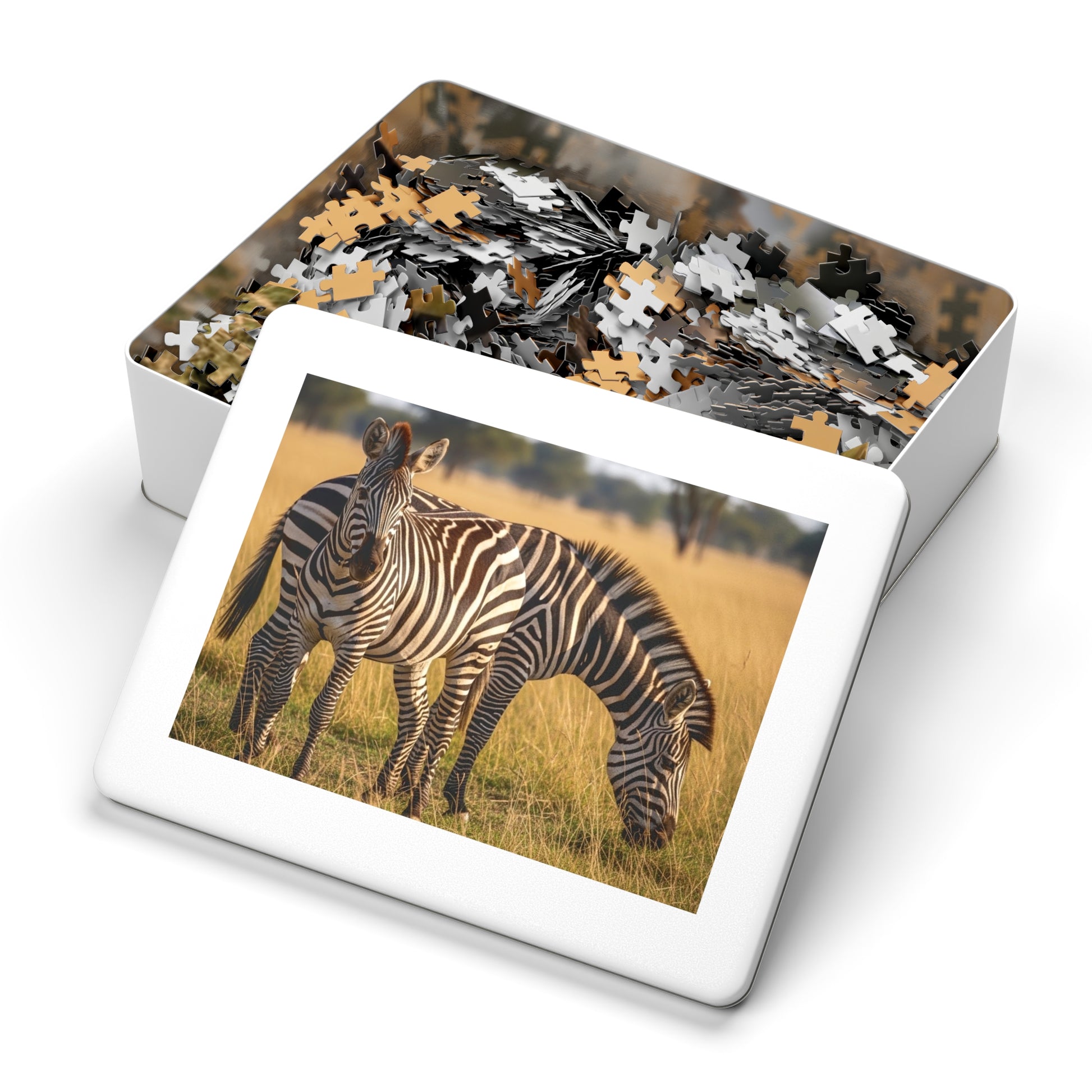 This striking jigsaw puzzle captures two elegant zebras standing peacefully in golden savannah grass under warm African sunlight. Their bold black and white stripes create a stunning natural pattern against the soft earth tones of the grassland. The scene feels calm, balanced, and deeply connected to the wild, offering a visually satisfying and relaxing puzzle experience.